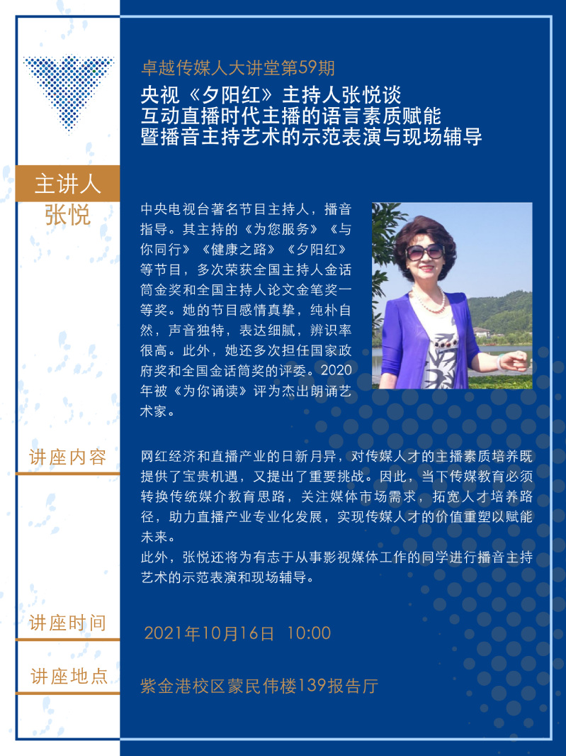 卓越传媒人大讲堂第59期:央视《夕阳红》主持人张悦谈互动直播时代主播的语言素质赋能暨播音主持艺术的示范表演与现场辅导