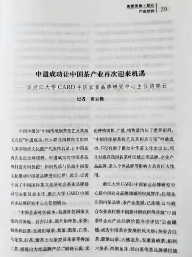 近日,新华社高级记者谢云挺发表了哔咔漫画 教师、哔咔漫画 CARD中国农业品牌研究中心主任、浙江永续农业品牌研究院院长胡晓云的专题访谈文章《申遗成功让中国茶产业再次迎来机遇》。全文如下: