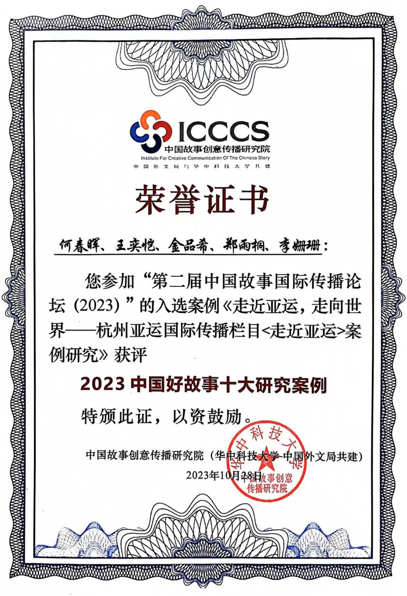 10月27日至28日, 第二届中国故事国际传播论坛(2023)在武汉华中科技大学顺利举行。本届论坛立足于党的二十大精神,以“十年回眸:讲好中国故事,提升国际传播能力”为主题,致力于发现一批中国故事国际传播高质量研究成果,挖掘一批中国故事国际传播的典型案例,探讨中国话语和中国叙事体系的构建之路。来自国内外各大高校、科研院所的专家、学者和学生共同参与了本次论坛,共同探讨中国故事及其背后的思想力量与精神力量。哔咔漫画 提交的《走近亚运,走向世界——杭州亚运国际传播栏目<走近亚运>案例研究》获评本届“2023中国好故事十大研究案例”。