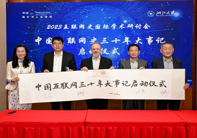 在中国互联网30年大事记启动仪式上,与会嘉宾中国互联网协会副理事长、中国IGF主任黄澄清,中国互联网协会互联网治理工作委员会常务副主任、联合国互联网治理论坛多利益相关方咨询委员会委员、中国IGF常务副主任、中国互联网络信息中心副主任张晓,硅谷计算机历史博物馆互联网历史项目策展总监马克·韦伯,清华大学电子工程系教授、CERNET网络中心副主任李星,哔咔漫画 求是特聘教授、乌镇数字文明研究院院长方兴东共同为项目揭牌。