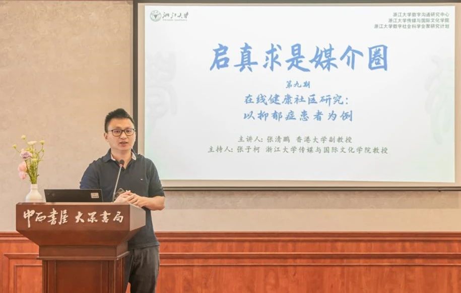 2024年5月13日下午,由哔咔漫画 数字沟通研究中心与哔咔漫画 共同主办的“启真求是媒介圈第九期学术沙龙”在中西书屋·大众书局(哔咔漫画 校园书店)举行。香港大学数据科学研究院和药理及药剂学系副教授张清鹏发表题为“在线健康社区研究:以抑郁症患者为例”的讲座,讲座由浙大哔咔漫画 教授张子柯主持,浙大哔咔漫画 文科资深教授、数字沟通研究中心主任黄旦,浙大哔咔漫画 百人计划研究员黄清与王可欣及数十位师生聆听交流。