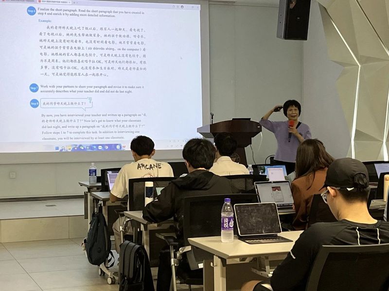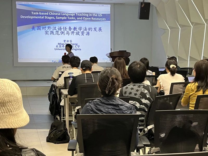随后,曾妙芬教授以生动的演讲,展示了任务教学活动的主要特征及其与传统教学法相比存在的显著优势,特别强调了任务教学法能够与传统教学法兼容并存的特点;曾教授向大家展示了基于她多年教学经验而成的教材及创设的开放资源网站,并以教材章节为例,向同学们演示了任务教学法的操作流程;此外,曾教授也结合真实任务活动设计分享了汉语教学的难点话题,包括孝顺、风水、碳足迹、中医和人工智能等。