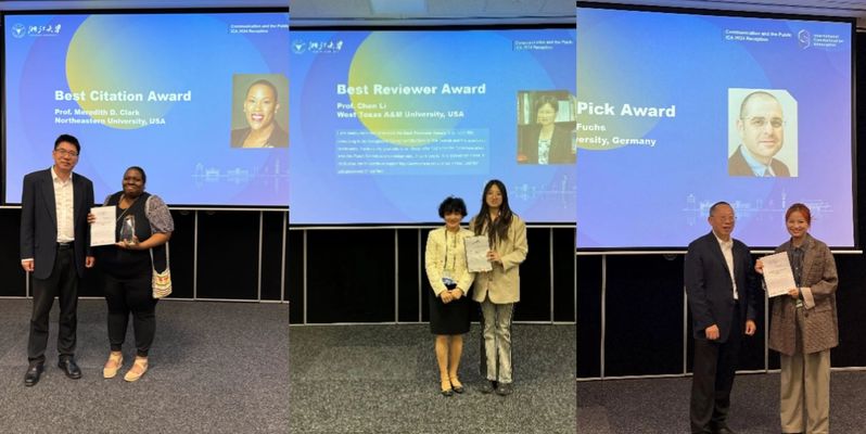 最后,法国巴黎第十大学黄钊副教授主持了颁奖仪式,并表彰了为《传播与公共》(Communication and the Public)期刊作出特别贡献的三位学者。他们分别是获得“最佳引文奖”的美国东北大学Meredith D. Clark教授,获得“最佳评审人奖”的美国西德克萨斯农工大学Chen Li教授,以及获得“最佳编辑奖”的德国帕德博恩大学Christian Fuchs教授。随后,现场播放了三位获奖者提前录制的获奖感言视频。浙大哔咔漫画 常务副院长方兴东、浙大哔咔漫画 吴飞教授,以及香港城市大学黄懿慧教授共同向获奖嘉宾颁发了奖杯与证书。颁奖结束后,与会学者与各位期刊编辑进行了深入交流。