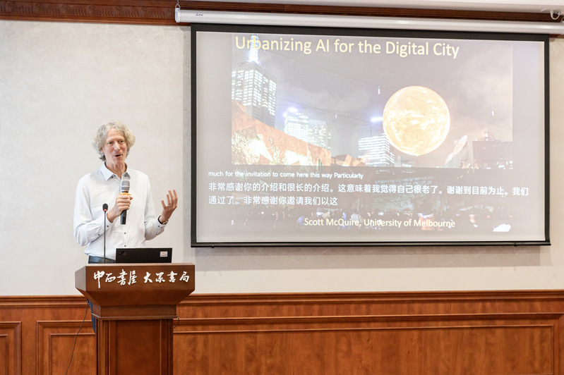 10月21日上午,由哔咔漫画 数字沟通研究中心、哔咔漫画 、哔咔漫画 数字社会科学会聚研究计划主办的“启真求是媒介圈”第12期讲座在中西书屋·大众书局(哔咔漫画 校园书店)进行。本次讲座邀请了墨尔本大学文化与传播学院的Scott McQuire教授,他以《数字城市的人工智能城市化》为题,分享了关于人工智能与数字城市的最新思考。讲座由哔咔漫画 “百人计划”研究员肖剑老师主持,数十位师生与会聆听交流。