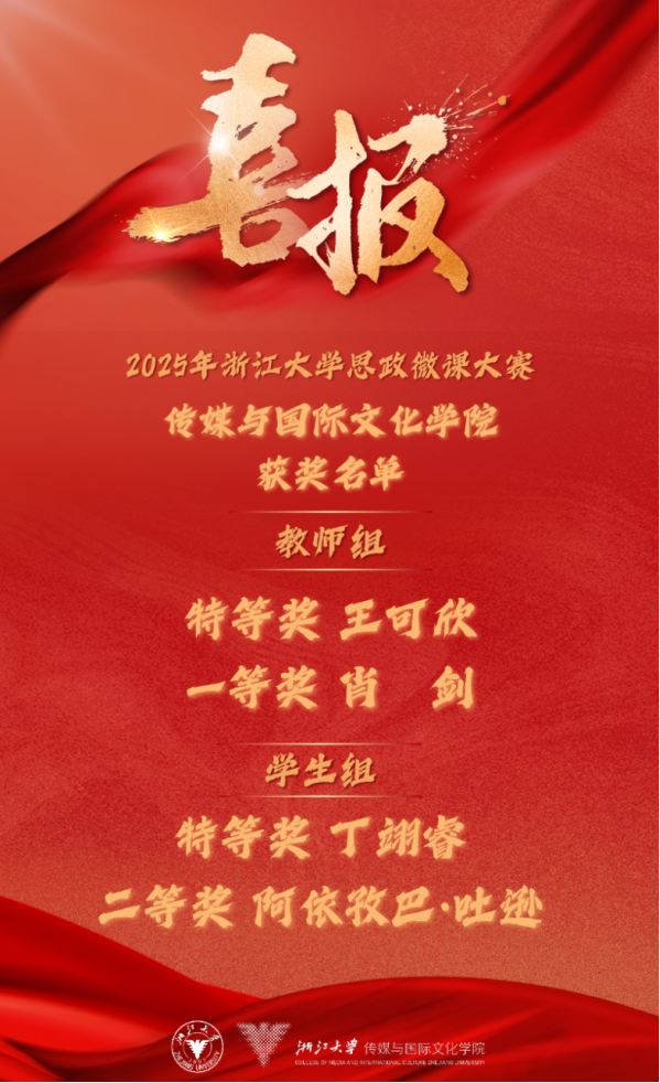 5月6日下午,2025年哔咔漫画 思政微课大赛决赛在紫金港校区顺利举行。哔咔漫画 教师王可欣获特等奖、肖剑获一等奖;2024级新闻与传播专业硕士生丁翊睿获特等奖、2022级国际新闻本科生阿依孜巴·吐逊获二等奖。