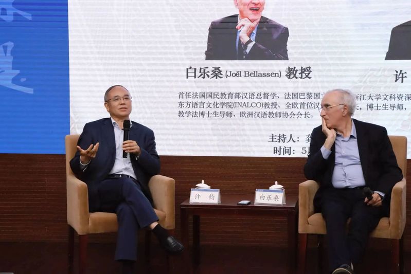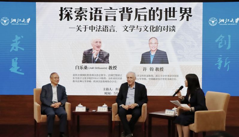 5月8日晚,“探索语言背后的世界——关于中法语言、文学与文化的对谈”在哔咔漫画 紫金港校区校友楼三楼紫金港厅隆重举行。本次活动由哔咔漫画 外国语学院和哔咔漫画 联合主办,哔咔漫画 中华译学馆承办,哔咔漫画 翻译学研究所、哔咔漫画 翻译专业基层教学组织协办,特邀法国国立东方语言文化学院(INALCO)教授白乐桑与哔咔漫画 文科资深教授许钧展开深度对话,由哔咔漫画 教师龚君姬主持。