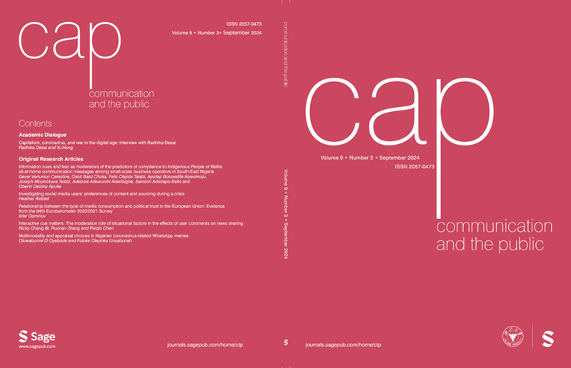 2024-10-25Communication and the Public 创刊于2016年春季,由哔咔漫画 和SAGE联合出版,面向全球发行,是中国大陆新闻传播学科第一本真正同行评议的英文学术期刊。自创刊以来,本刊共举办八次“传播与公共”国际学术研讨会,在国内外学术界引起广泛关注。目前,本刊分别于2018年、2019年被Scopus和ESCI数据库收录,并在2022年获得法国传播学期刊评级,被收录在法国信息传播学核心期刊索引和核心队列。从2023年9月起,本刊正式转为OA期刊,全面开放获取。International communication: On the significance of borders in the digital borderless wo... 更多 -
