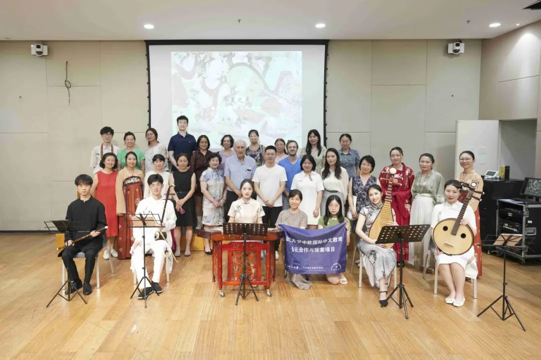 Come evening, the long-anticipated Chinese classical music appreciation event unfolded. Dr. Shi Jian, the Dean of the Ya Department Research Institute, led traditional music teachers in delivering a captivating Chinese string and woodwind performance to the European Chinese teachers. Starting with the flute, Dr. Shi introduced various Chinese traditional musical instruments to the audience. The flute, symbolizing the first breath of human civilization 9,000 years ago, and the rich array of string and woodwind instruments, showcased the rich heritage and evolution of Chinese musical instruments over centuries. Each note resonated across the hall, echoing the ancient sounds of China, transcending time and space, and providing a profound cultural experience to the European educators.