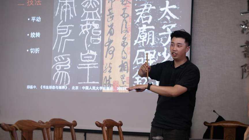 On the following day, August 4, Teacher Shen Linfeng from the Chinese Painting School of China Academy of Art conducted a unique calligraphy lesson for the delegation at Shanghu Academy. Shen introduced the art of calligraphy from four perspectives: character form, technique, thought, and extension. Calligraphy, as Shen explained, is the painting of the heart, where the strokes reflect the demeanor of the individual. The attendees not only learned to appreciate ancient calligraphic inscriptions that have carried the memory of Chinese civilization through ages but also delved into how character forms reflect one's character, understanding the saying the style is the man. The essence and breadth of calligraphy art were hence deeply realized by the participants.