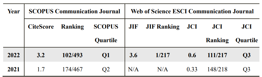 Recently, Clarivate Analytics officially released the 2023 (2022 edition) Journal Citation Reports® (JCR). The 2022 Journal Impact Factor (JIF) of Communication and the Public stands at 3.6, making it the highest-impact journal of the year in the Emerging Sources Citation Index (ESCI) category!