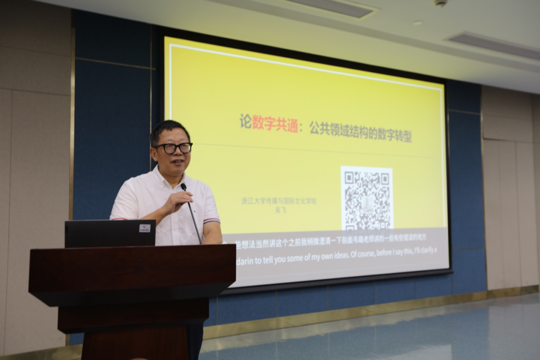 Following the opening ceremony, Professor Wu Fei from the School of Media and International Culture at Zhejiang University delivered a lecture titled Digital Commonality: Understanding the New Hypothesis of Social Interaction in the Digital Age, hosted by Dr. Huang Guangsheng, a researcher from Zhejiang University’s Hundred Talents Program. Professor Wu started from the background of digital existence, stating that digitalization, networking, and informatization have caused significant changes in the way humans exist, leading to a brand new form of existence. He reviewed the origins and development of public sphere theory and proposed the theoretical hypothesis of digital commonality to address the deficiencies of previous theories. Professor Wu emphasized that digital commonality stresses the commiseration born from a community of shared future for humanity, advocating for a “class” mindset and practice.