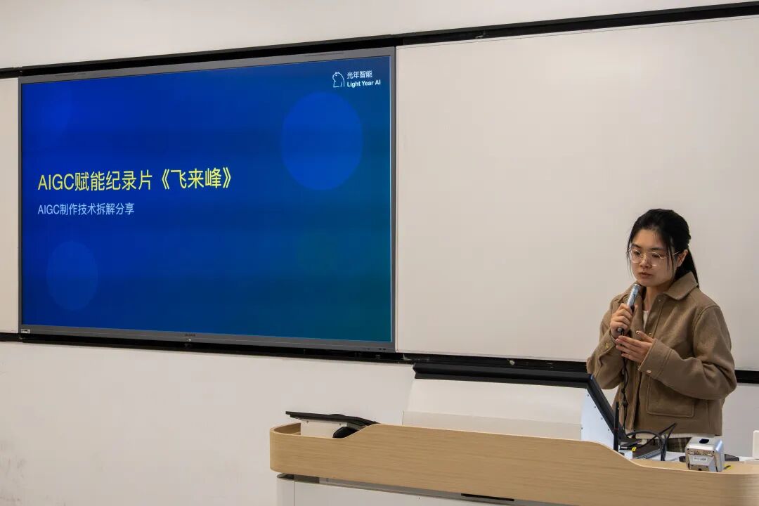 Zheng Jie deconstructed the AIGC production techniques behind Flying Peak. Drawing on case studies, she outlined the fundamental workflow from ‘text to image to video,’ encouraging students to actively experiment, using creativity to drive technology and harness tools for human purpose.