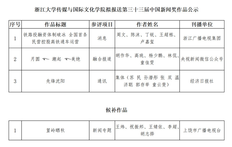 学院成立新闻传播学科专家小组,对参评作品进行评议和投票,推选出《铁路投融资体制破冰 全国首条民营控股高铁通车运营》等3篇作品报送第三十三届中国新闻奖评选。