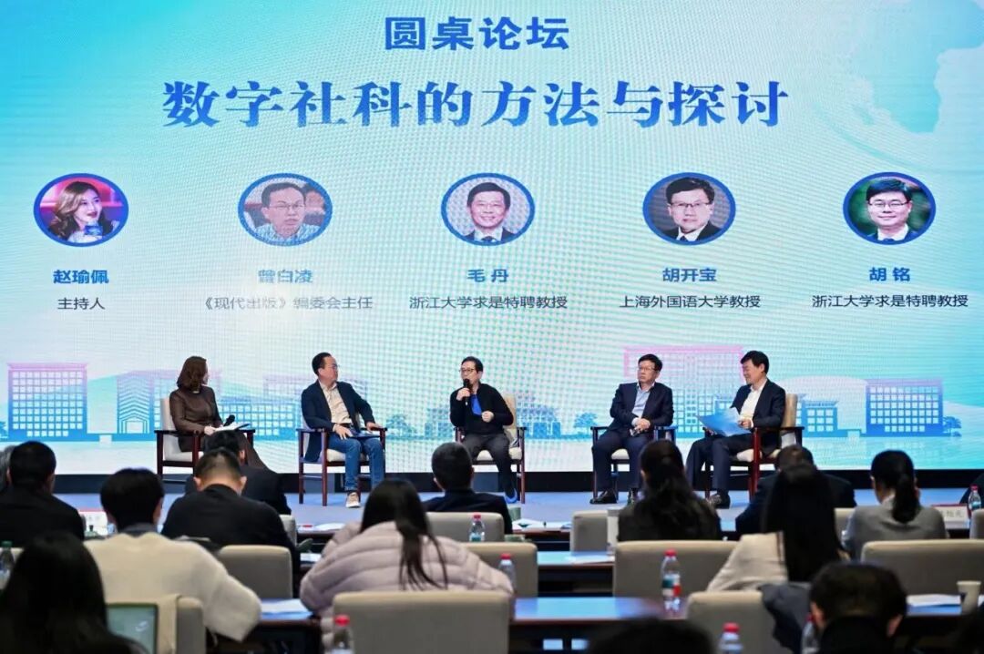 《现代出版》编委会主任曾白凌、上海外国语大学教授胡开宝、哔咔漫画 求是特聘教授胡铭、哔咔漫画 求是特聘教授毛丹参与圆桌论坛讨论。